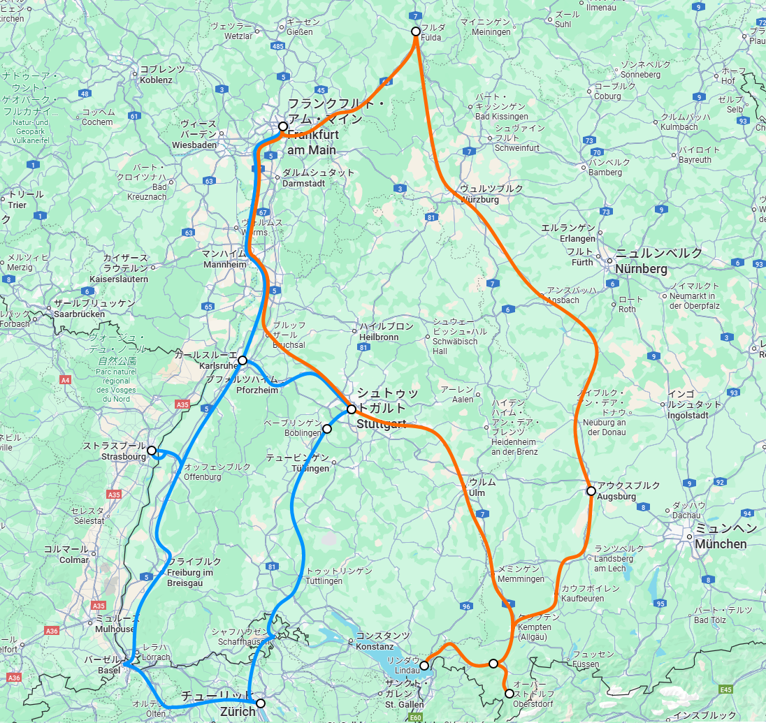 さて、まずは今回のルートを先におさらい。これ前回のスイス弾丸旅行の時に忘れていたので、そちらのルートは水色で。今回のルートは橙色で表示しております。基本的に、未開拓の地域がある場合にはそちらを経由するようにしているので、行きと帰りで別々のルートを通ってみることに。自分の部屋にある乗りつぶしマップは今回もかなりの距離の線を描きましたとさ。では本題へ。