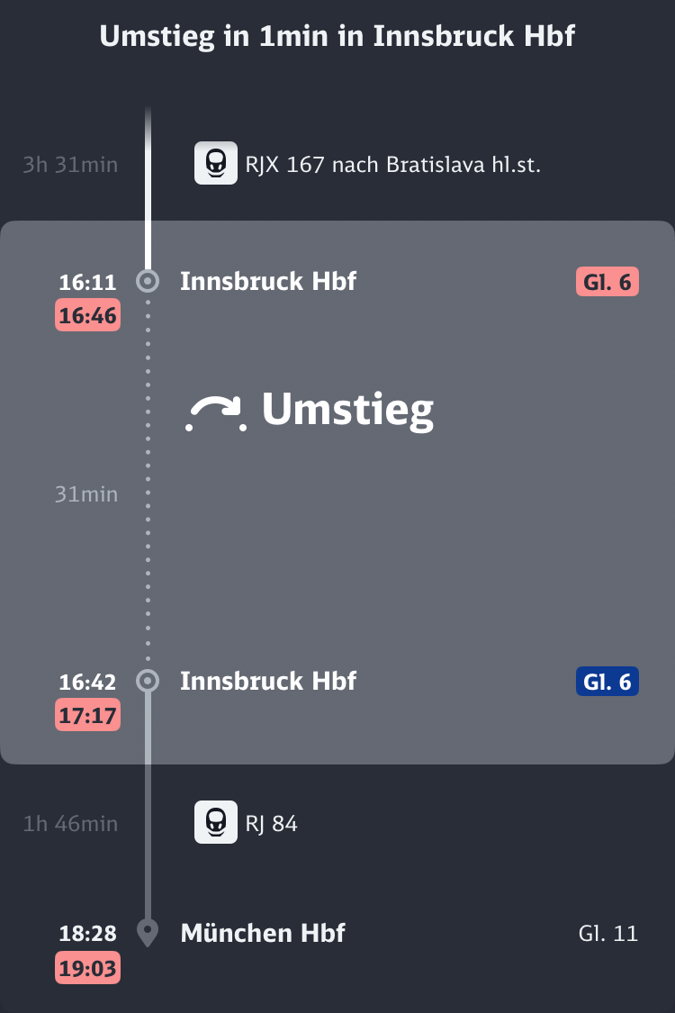 25分延を超えたあたりで、乗換えが不安になったもので接続待ちを申請。保証は無いが、ドイツ国内ではDBからDBだと大体接続取ってくれるんですよね。ÖBBも果たしてしてくれるのだろうかとリアクション待ち。