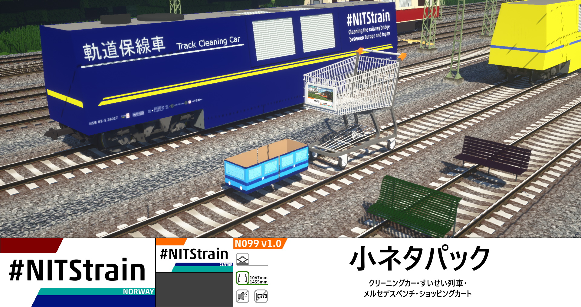 今回の再リリースでは、既存のショッピングカートとクリーニングカーが全体的にリニューアルされ、新たにメルセデスベンチが追加されました。また、クリーニングカーは日本仕様とドイツ仕様の2バージョンが加わります。今後のアップデートでは、クリーニングカーで建築限界測定ができるように更新する予定です。